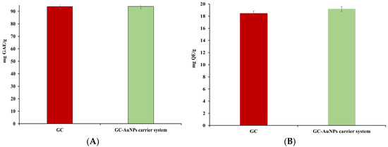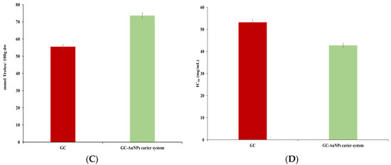 No significant differences were found in the TPCs or flavonoid assays for the novel carrier system compared to the greater celandine. However, in FRAP and DPPH tests, the CG-AuNPs carrier system exhibited higher antioxidant activity than the herb plant sample. Thus, the maximum value of the FRAP assay indicated an increase (up to 24%) for the carrier system. Similarly, the IC50 value was lower than that of the greater celandine by over 24%. These results can be attributed to modifications in the surface electric charge of metallic nanoparticles loaded into herb particles, as well as the synergistic action of AuNPs and the bioactive phytoconstituents [88,89].