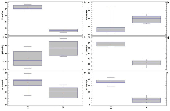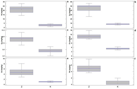 Box-and-whisker plots of the basic statistical parameters for the content of heavy metals (mg/kg) in the contaminated soil (Z) and in the control experimental field (K): (a) Ni; (b) Cu; (c) Cd; (d) Cr; (e) Pb; and (f) As. Legend: middle sign—mean value, middle line—median, box—mean value and standard deviation, whiskers—variation range.