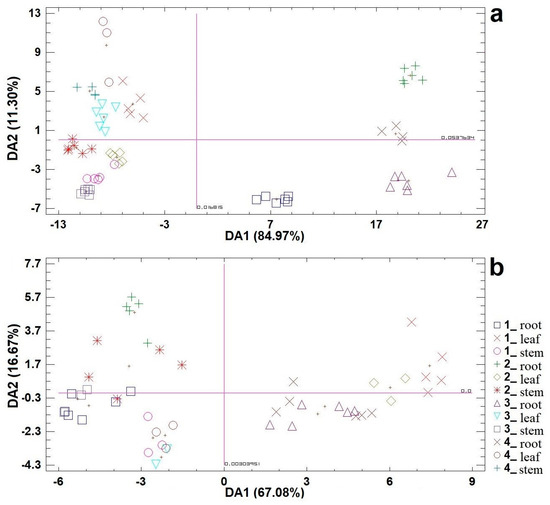 Canonical discriminant analysis (CDA) scatterplots for the content of heavy metals (mg/kg) in different organs (root, leaf, and stem) of four willow genotypes (1–4): (a) on contaminated soil and (b) on the control experimental field.
