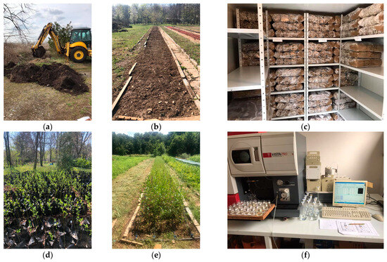 Experiment setup. (a) Excavating contaminated soil from Kolubara Mining Basin, Serbia. (b) Control plot (nursery bed) in the Nursery of the Faculty of Forestry, University of Belgrade. (c) Cuttings of the willow clones used for the experiment. (d) Polyethylene bags filled with the contaminated soil and used to plant the willow clones. (e) Willow clones planted on the control plot (nursery bed). (f) Determination of the heavy metal content in plant samples with an ICP-OES spectrometer VISTA-PRO.
