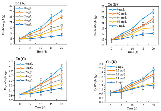 The biomass of P. stratiotes after Zn (A,C) and Cu (B,D) exposure at the different concentrations and treatment times.