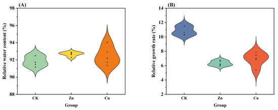 The relative water content (A) and relative growth rate (B) of P. stratiotes in CK (control), Zn (8 mg/L) stress, and Cu (1 mg/L) stress groups at day 20. The parameters of a single sample are shown in each plot (indicated by small black rhombs). CK means the plants cultivated in the Hoagland solution without metal solution exposure.