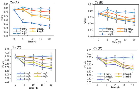 Chlorophyll fluorescence parameters were found to be strongly correlated with whole-plant growth following environmental stress and therefore can be considered reliable indicators of the intensity of stress [23]. Among these parameters, Fv/Fm is the maximum photochemical quantum yield of PS II or the light energy conversion efficiency of maximum PS II. It is commonly used as a crucial indicator of the photosynthetic system, measuring the PSII primary light energy conversion efficiency of leaves and indicating the response of plants to stress [24]. As shown in Figure 3A,B, the Fv/Fm values of the control group showed stable changes, fluctuating between 0.78 and 0.80. Hence, the decreases in Fv/Fm after exposure to Zn and Cu were concentration- and time-dependent. On the 20th day, Zn exposure at concentrations of 1, 2, 4, and 8 mg/L resulted in decreased Fv/Fm values of 0.75, 0.69, 0.64, and 0.57, respectively. They decreased by 3.85%, 11.54%, 17.95%, and 26.92%, respectively, when compared with the blank control. The treatment of Cu at concentrations of 0.2, 0.4, 0.8, and 1 mg/L also resulted in the inhibition of the Fv/Fm values. After 20 days of exposure of Cu, the Fv/Fm values were 0.74, 0.73, 0.72, and 0.71, respectively, which were decreased by 5.13%, 6.41%, 7.69%, and 8.97%, respectively, when compared with the blank control. The results were similar to those of Hayat et al., who concluded that the Fv/Fm of plants under heavy metal stress was lower than that of blank control, and that the higher concentration, the faster and greater the decrease [25]. This indicated that both Zn and Cu stress could reduce the light energy capture efficiency and irreversibly affect the photosynthetic reaction center. Some heavy metals, such as Hg2+, Cu2+, Cd2+, Zn2+, and Ni2+, replace the central Mg2+ atom in the chlorophyll molecule, which lowers the fluorescence quantum yield and shifts the fluorescence spectrum. In addition, the decrease in Fv/Fm value indicated the photoinhibitory or photo-oxidative effects on PS II [26]. Photosynthesis inhibition and the oxidative stress of heavy metals on plants are commonly reported [27,28].