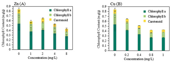 Chlorophyll content was determined after plants were grown in the different concentrations of Zn (1, 2, 4, and 8 mg/L) or Cu (0.2, 0.4, 0.8, and 1 mg/L) for 20 days. The plants in the Hoagland solution were also assessed. Fresh leaves were thoroughly cut and submerged in 10 mL of 96% ethanol in the dark for 2 days at 4 °C until the residues became almost colorless. The absorbance of the extract solutions was measured at 470, 649, and 665 nm, along with the blank of the solvent (96% ethanol), using a spectrophotometer UH5300 (Hansatech Instruments, King’s Lynn, UK). Chlorophyll contents were calculated according to Porra et al. [49].