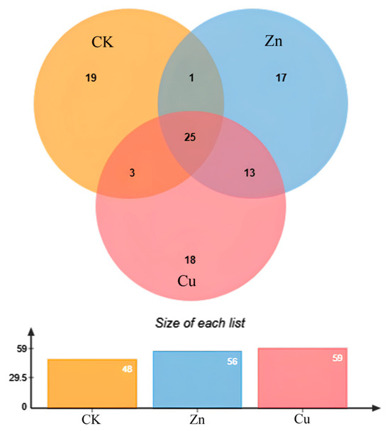Venn diagram analysis of the compounds of root exudates in CK (control), Zn (8 mg/L) and Cu (1 mg/L) treatment for 20 days. CK means the plants cultivated in the Hoagland solution without metal solution exposure.