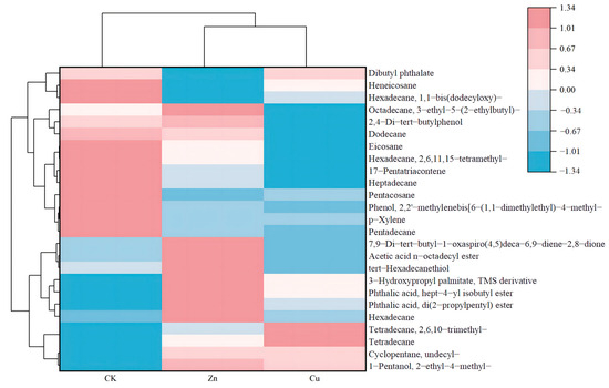 Heat map analysis of the relative amount of root exudates in CK (control), Zn (8 mg/L) and Cu (1 mg/L) treatment for 20 days. CK means the plants cultivated in the Hoagland solution without metal solution exposure.