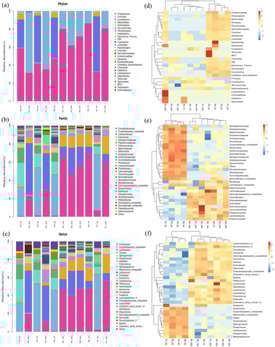 Taxonomic analysis and heatmap analysis of soybean haylage flora at different cutting stages and different fermentation stages. (a–c) Taxonomic analysis at the phylum, family, and genus level during semidry ensiling, (d–f) heatmap analysis at the phylum, family, and genus level during semidry ensiling.