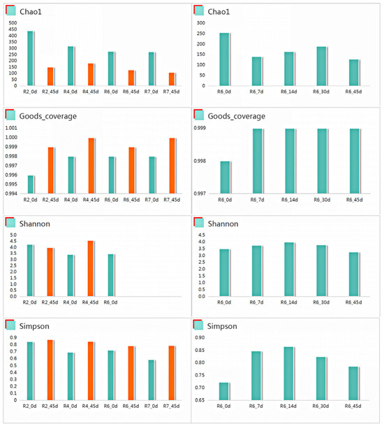 Figure 1 presents comparisons of R2_0d, R4_0d, R6_0d, R7_0d, R2_45d, R4_45d, R6_45d, R7_45d, as well as R6_0d, 7 d, 14 d, 30 d, 45 d. The former two groups of data explained the variation in microbial abundance in semidry silage with the postponement of the cutting period. The latter group illustrated the change in microbial abundance in the soybean semidry silage as ensiling fermentation was prolonged.