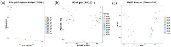 The effects of soybean mowing time and fermentation time on the beta diversity of the semidry silage are shown in Figure 3. In this experiment, unweighted UniFrac PCA (Figure 4a) and PCoA (Figure 4b) analyses were conducted, revealing relatively long distance nodes for the R2, R4, R6, and R7 cutting periods. This indicates that fermentation time strongly influences the microbial community structure in soybean semidry silage. The non-metric multidimensional scaling (NMDS) analysis (Figure 4c) is an important measure of beta diversity, with the stress coefficient used to evaluate the analysis results. The results showed a stress coefficient of 0.02, indicating a significant difference in species composition between 0 d and 45 d fermentation group (p < 0.05).