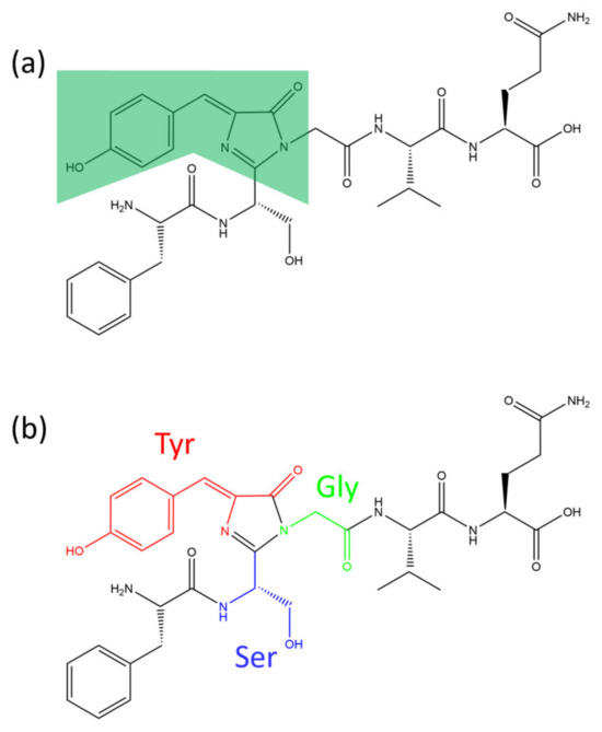 Aequorea GFP from Aequorea victoria contains a chromophore and amino acids [30]. The chromophore’s molecular 4-(p-hydroxybenzylidene)-5-imidazolone moiety (HBI) is shown in Figure 1 [31].