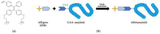 The creation process of AIE@amyloid [70]. (a) Chemical structure of EPB (C38H44Br2N2O2, 2,20-(((2-(4-ethynylphenyl)-2-phenylethene-1,1-diyl) bis-(4,1-phenylene)) bis(oxy)) bis-(trimethylethanaminium) bromide). (b) The construction of AIE@amyloid. AIE-active amyloid proteins are synthesized from EPB and UAA–amyloid through a click chemical reaction.