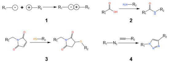 Several click chemistries patterns of AIEgens linked to biological macromolecules. (1) Two groups containing different charges form new compounds through electrostatic interaction. (2) Carboxyl forms carboxamine with compounds containing amino groups. (3) Maleimide reacts with compounds containing sulfhydryl groups to form thioester. (4) Azide forms 1,4-triazole with compounds containing alkynyl groups [94].