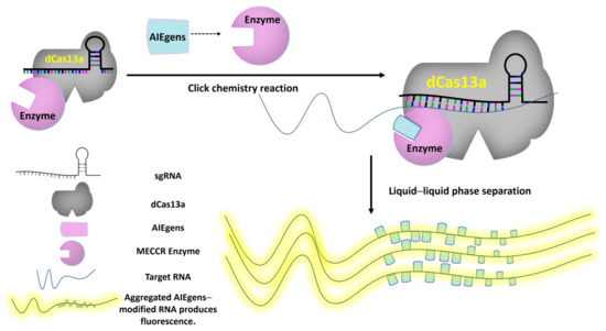 A modification enzyme with a click chemical reaction function with RNA (MECCR) is fused to the dCas13a protein, which contains sgRNA. When the MECCR enzyme recognizes AIEgens, a click chemical reaction can occur. CRISPR/Cas13a-mediated click chemistry makes AIEgen modification target-specific. When a large amount of target RNA is modified by AIEgens, the RNA molecules generate RNA fluorescence in plant cells based on the aggregation effect of liquid–liquid phase separation.