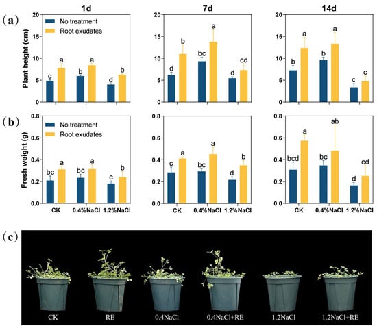 Effects of Suaeda glauca root exudates (REs) on the growth of alfalfa at 1 day, 7 day, and 14 day of salt stress. (a) Shoot height; (b) aboveground fresh weight; (c) plant growth phenotype chart at 14 d. CK represents a 0% NaCl concentration. No treatment represents the application of ultrapure water equivalent to REs, and root exudates represents the application of REs. Different lowercase letters represent significant differences between different treatments at the same time (p < 0.05).
