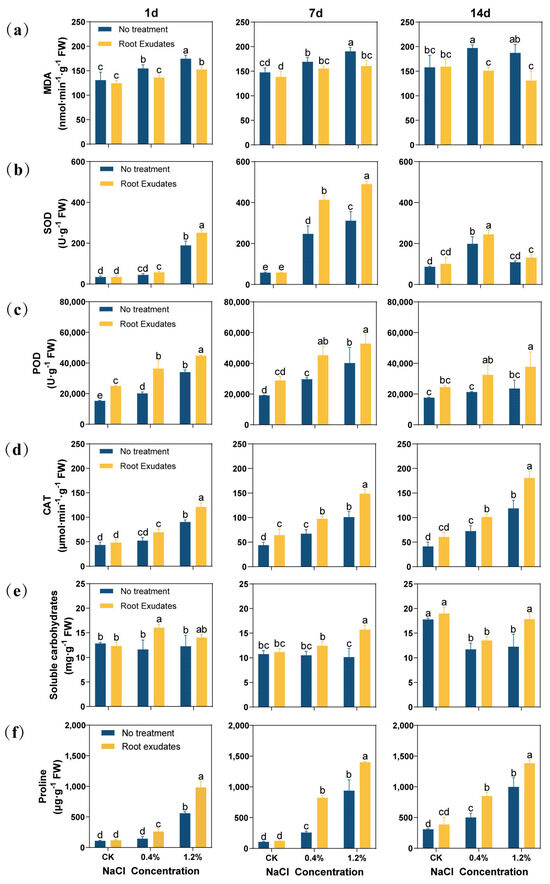 Effects of Suaeda glauca root exudates on membrane peroxidation, antioxidant enzymes, and the osmotic substances in alfalfa leaves at 1 day, 7 day, and 14 day of salt stress. (a) Malondialdehyde content (MDA); (b) superoxide dismutase (SOD); (c) peroxidase (POD); (d) catalase (CAT); (e) soluble sugar content; (f) proline content. CK represents a 0% NaCl concentration. No Treatment represents the application of ultrapure water equivalent to the REs, and Root Exudates represents the application of REs. Different lowercase letters represent significant differences between different treatments at the same time (p < 0.05).