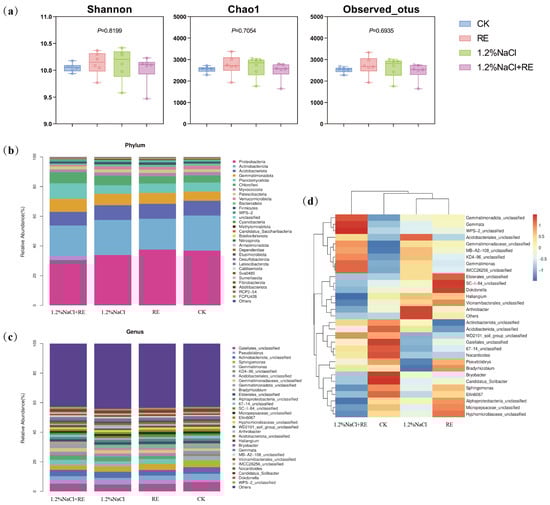 Effects of Suaeda glauca root exudates on the soil microbial community structure of alfalfa on the 14th day of salt stress. (a) The soil bacterial diversity index of different treatments; (b) the relative abundance of the top 30 most abundant bacterial phyla in the bacterial community structure of different treatments; (c) the relative abundance of the top 30 most abundant bacterial genera in the bacterial community structure of different treatments; (d) the distribution of the soil bacterial community (genus-level) in different treatments. CK and 1.2% NaCl indicated the application of ultrapure water equivalent to the REs, and RE and 1.2% NaCl + RE indicated the application of REs.