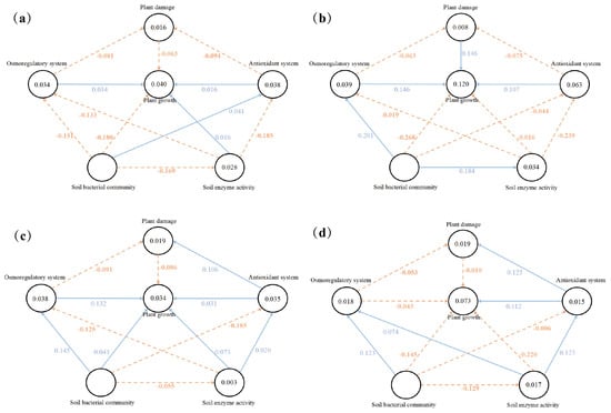 The PLS-SEM model diagram shows the effects of the CK (a), RE (b), 1.2% NaCl (c), and 1.2% NaCl + RE (d) treatments’ latent variables (plant damage, osmotic adjustment system, antioxidant system, soil enzyme activity, and soil bacterial community interactions) on plant growth. The arrows indicate the connections between latent variables. The orange dotted lines indicate a negative correlation, and the blue solid lines indicate a positive correlation.