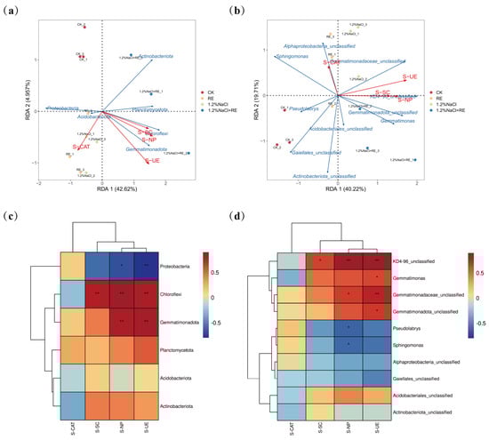 Relationship between the soil bacterial community’s structure and environmental factors of Suaeda glauca root exudates on the 14th day of alfalfa growing under salt stress. (a) Redundancy analysis (RDA) of the rhizosphere soil’s bacterial phyla (6 most abundant phyla) and soil enzyme activity in a single sample of different treatments; (b) redundancy analysis (RDA) of the rhizosphere soil’s bacterial genera (10 most abundant genera) and soil enzyme activities in a single sample of different treatments; (c) Spearman correlation between soil bacterial community (6 most abundant phyla) and soil enzyme activity; (d) Spearman correlation between soil bacterial community (10 most abundant genera) and soil enzyme activity. The blue arrows represent the dominant bacteria of the soil, the red arrows represent the environmental factors, and the length of the arrows represents the influence of the environmental factors on the dominant bacteria. The longer the length of the arrow, the greater the influence. CK and 1.2% NaCl were plied with the same amount of ultrapure water as REs, and the RE and 1.2% NaCl + RE treatments were plied with REs. S-CAT, S-SC, S-NP, and S-UE represent soil catalase, soil invertase, soil neutral phosphatase, and soil urease, respectively. * 0.01 ≤ p < 0.05, ** 0.001 ≤ p < 0.01.