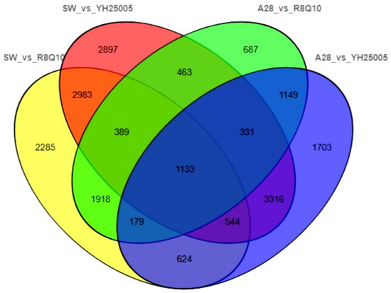 To uncover the transcriptional regulation profile during seed fatty acid synthesis, we compared the transcriptomic data (deposited in NCBI GEO database under accession No. GSE186952) of young seeds at 24 DAP (in the early-mid stage of seed development) and found a total of 6249 to 12056 DEGs (Table 1) in a pairwise comparison between A28 (or SW) and R8Q10 and A28 (or SW) and YH25005 (Supplementary Materials, Dataset S1). As shown in a Venn diagram (Figure 1), there were 1133 DEGs shared by the four sets in the transcriptome comparison. There were 5324 DEGs shared by A28 and SW when they were compared with YH25005, and there were 3619 DEGs when they were compared with R8Q10, indicating more complex transcriptional regulation in YH25005.