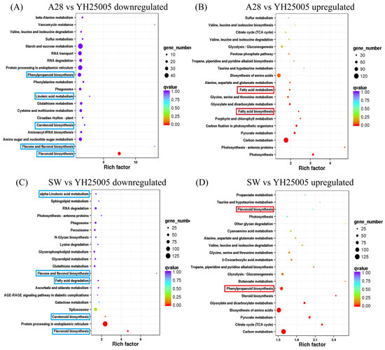 Enrichment of KEGG pathways based on up/downregulated DEGs of YH25005 in comparison to SW and A28. Some interesting KEGGs related to fatty acid accumulation and seed coat pigments are indicated by blue boxes (downregulated DEGs) or red boxes (upregulated).