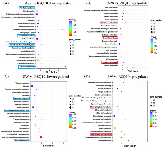 Enrichment of KEGG pathways based on up/downregulated DEGs of R8Q10 in comparison to SW and A28. Some interesting KEGGs related to fatty acid accumulation and seed coat pigments are indicated by blue boxes (downregulated DEGs) or red boxes (upregulated).