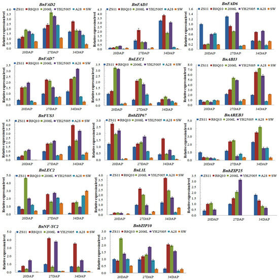 The expression levels of BnFUS3, BnABI3, BnLEC1, BnL1L, BnbZIP67, BnbZIP25, and BnbZIP10 in the three high-ALA accessions were higher than that in ZS11 and much higher than those in the low-ALA accessions. Particularly, the expression of BnbZIP10 in SW was lower than in A28 and ZS11. The expression of AREB3/bZIP66 in 2006L and R8Q10 was much higher than that in the other accessions, especially in the middle and mid-late stages. The upregulated expression of genes encoding LAFL members in high-ALA accession may elevate BnFAD3 (possibly also including BnFAD2 and Bn FAD7) expression.