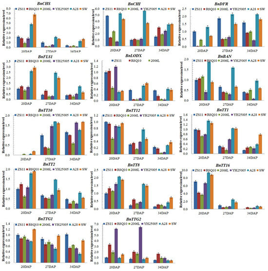 TT4/CHS, TT5/CHI, FLS1/FLS, TT7/DFR, TT18/LODX, BAN/ANR, and TT10 are all structural genes in the flavonoid synthesis pathway. In the brown-seeded plant accessions ZS11, A28, and SW, the expression of these structural genes and the transporter BnTT12 decreased gradually with seed development, while BnTT10 increased gradually with seed development (Figure 5). This trend corresponds well to the fact that the synthesis of flavonoids mainly occurs in the early stage of seed development; then, in the medium and later stages, TT10’s important function is to condensate proanthocyanidins from flavonoids and deepen the seed coat color gradually in the mid-late stage. The expression levels of BnCHS, BnCHI, BnDFR, BnFLS, BnLDOX, and BnBAN in the low-ALA accessions were much higher than those in the three high-ALA accessions. The expression of BnTT10 in the high-ALA accessions was lower than in ZS11 and significantly lower than in the low-ALA accessions. The expression levels of BnTT12 in the low-ALA accessions A28 and SW were significantly higher than in other accessions in the middle and mid-late stages.