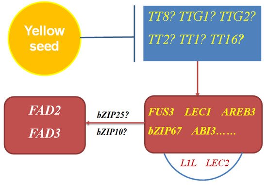 Based on the above analysis, we proposed a regulatory network of BnFAD3 expression in yellow-seeded rapeseed (Figure 6). The dysfunction of a TT gene, such as Arabidopsis TT16, TT8, and TT2, or rapeseed yellow-seeded genes, will cause the downregulation of most TT genes [14,20,21,22], like our present data in yellow-seeded accessions R8Q10 and YH25005. It is reasonable to suppose that downregulation of many TT genes will activate TFs such as LAFL or LAZA and then indirectly boost the enzyme activity of BnFAD2 and BnFAD3 (Figure 6). In other words, the yellow-seededness trait is a key positive factor that indirectly promotes the upregulation of BnFAD3 (BnFAD2, BnFAD6, and BnFAD7 may also be included) through a ‘bridge’ of LAFL/LAZA members. This knowledge is useful for a seed-quality breeding scheme, and the yellow-seededness trait can be used to increase the ALA content.