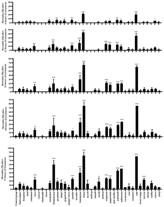 Mortality rates of T. urticae treated with plant essential oils at a concentration of 4 μL/mL at different time intervals (* p ≤ 0.05; ** p ≤ 0.01; *** p ≤ 0.001; **** p ≤ 0.0001).