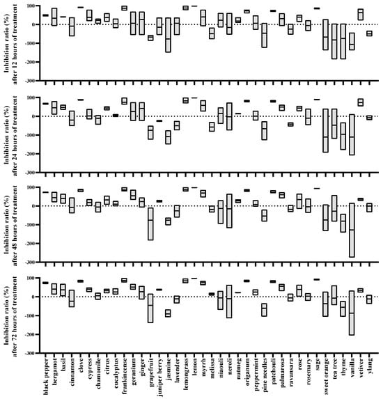 At 48 h, a total of 18 EOs were identified to inhibit the oviposition of female mites based on their inhibitory indices. Myrrh and palmarosa EOs exhibited increased inhibitory indices of 0.56 and 0.55, respectively, accompanied by inhibition rates of 69.35% and 59.83%. Additionally, the effect of juniper berry EO on the oviposition of female mites shifted from a stimulatory effect to an inhibitory effect, as evident from the rise in its inhibitory index from −0.11 to 0.13. Conversely, lemongrass EO showed a significant drop in its inhibitory index, reaching just 0.22, indicating a gradual decline in its impact on oviposition.