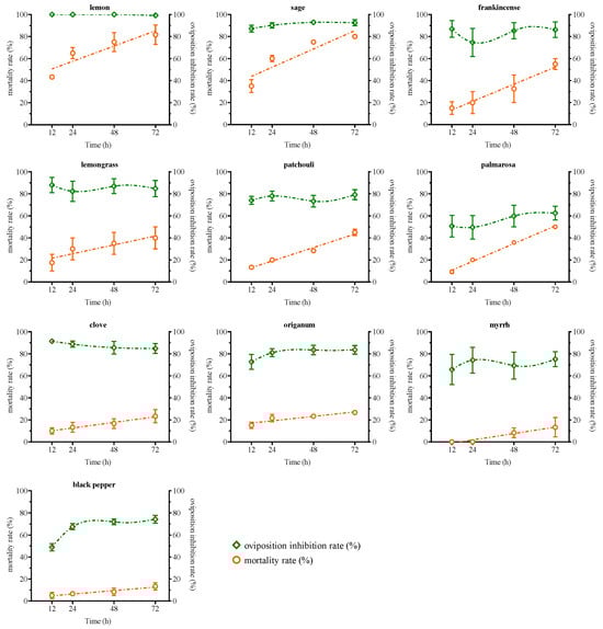 Frankincense, lemongrass, lemon, palmarosa, and sage EOs consistently maintained an oviposition inhibition index of 0.6 or higher for female T. urticae, with inhibition rates exceeding 70% (Table 2). At 72 h, T. urticae treated with lemon, sage, frankincense, lemongrass, patchouli, and palmarosa EOs showed average mortality rates exceeding 40%. Among them, excluding palmarosa, the other five EOs exhibited oviposition inhibition rates exceeding 80%, with lemon and sage EOs showing inhibition rates close to 100% (Figure 3). Although palmarosa achieved a mortality rate of over 40% on T. urticae, it had the lowest oviposition inhibition rate among the ten tested EOs. Conversely, black pepper, clove, myrrh, and oregano EOs exhibited lower mortality rates for T. urticae but demonstrated evident oviposition inhibition effects (Figure 3). Clove EO, which exhibited the strongest oviposition inhibitory effect on female T. urticae, maintained a rate consistently above 80% despite experiencing a slight decrease over time. The inhibitory rates of the other three EOs showed an upward trend from 12 h to 48 h, and then gradually stabilized from 48 h to 72 h in terms of oviposition inhibition rates. The oviposition inhibition rates of these three EOs were able to reach approximately 75% at 72 h (Figure 3).