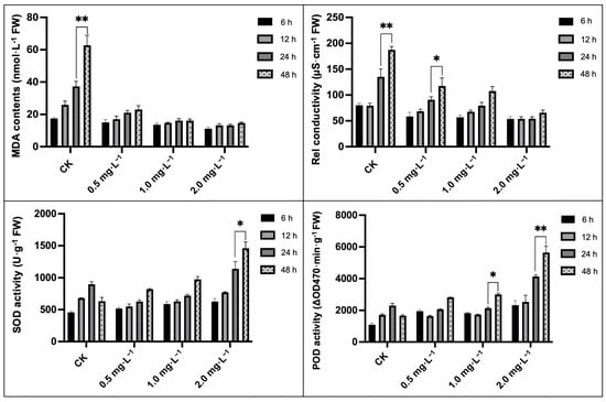 Impacts of different BR treatments on the malondialdehyde (MDA) content, relative conductivity, and SOD and POD activity of melon seedling leaves under downy mildew stress. Asterisks symbols represent the significant results at the ** p < 0.01 and * p < 0.05 levels, respectively.