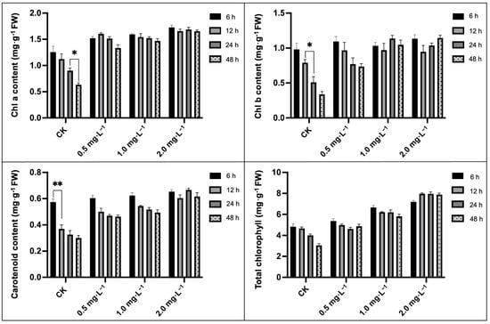 The total chlorophyll (Chl), chlorophyll a (Chl a), chlorophyll b (Chl b), and carotenoids contents decreased significantly with the duration of downy mildew infection (Figure 4), which was in line with the ever-increasing super-oxidized photosynthesis apparatus. It was observed that the carotenoids, total chlorophyll, chlorophyll a, and chlorophyll b contents decreased by 36.92%, 50.40%, 65.31%, and 47.36% at 48 h compared with 6 h and other time intervals, respectively. The exogenous application of 2.0 mg·L−1 BR significantly boosted photosynthetic pigmentation in leaves more than that of CK treatment; however, there were no evident alteration of the photosynthetic pigmentation contents within different concentrations of treatments, but every physiological index was maintained at a normal level, except for a notable total chlorophyll content, which increased nearly three times (264.52%).