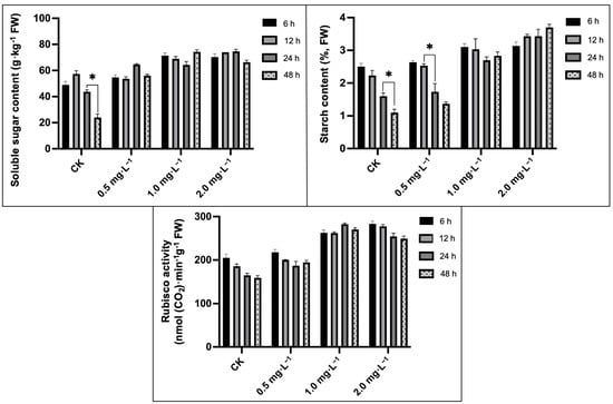 A total of 0.1 g of fresh leaf samples was weighed and ground in an ice bath, and Rubisco activity was determined by using the Rubisco Kit (Ge Ruisi, Suzhou, China) []. Then, a total of 0.5 g of leaf samples was isolated in hot alcohol (80%), and an alcohol-free liquid isolate was used for the estimation of total sugar and starch contents, as reported earlier [].