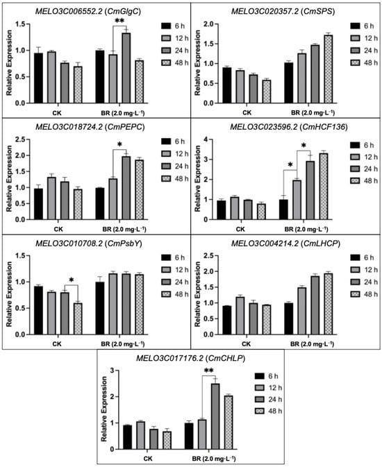 We examined the expression profiles of putative genes using qRT-PCR analysis in sampled seedling leaves of CK- and BR-treated groups at different time intervals (6 h, 12 h, 24 h, and 48 h) (Figure 6). The predicted melon genes related to photosynthetic pigment biosynthesis, PSII reaction center subunits, and carbohydrate metabolism showed a downward trend to some extent, particularly in terms of the PSII reaction center and chlorophyll biosynthesis, which decreased by 35.79% and 24.92%, respectively. However, the expression trend of the CmHCF136 gene (which had the maximum upregulation value) was up to three times higher at 48 h compared with CK (control, without BR treatment), CmGlgC, CmSPS, and CmCHLP, which were significantly upregulated in the BR-treated groups. In addition, the relative stable expression levels of other genes (CmPEPC, CmLHCP, and CmPSBY) demonstrated that BR application has protective characteristics in enhancing photosynthesis and carbohydrate metabolism on a molecular level.