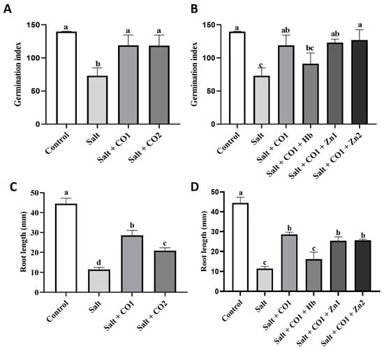 Effect of CO on germination index and root length of sorghum under salt stress. Germination index (A,B), root length (C,D) of sorghum seedlings treated with 0 mM of NaCl (control), 250 mM of NaCl (salt), a 1 μM of CO donor (Hematin; CO1), and 1.5 μM of CO donor (CO2), 0.1 g/L of hemoglobin (Hb), 5 μM of ZnPPIX (Zn1), and 10 of μM ZnPPIX (Zn2). The means ± SD (n = 3) were calculated from three biological replicates, and significant differences (p ≤ 0.05) were determined using ANOVA and the Tukey HSD post hoc test at a 95% confidence interval. Bars with the same letter are not significantly different.