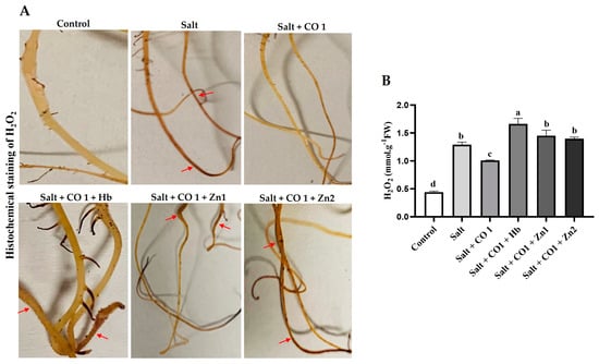 Effect of CO on the oxidative stress markers in Sorghum under salt stress. Histochemical detection of H2O2 (A), quantification of H2O2 (B) in sorghum seedlings. The red arrows on the histogram highlight the deep brown color indicative of H2O2 formation. Treatments: 0 mM of NaCl (control), 250 mM of NaCl (Salt), 1 μM of CO donor (Hematin; CO1), 0.1 g/L of hemoglobin (Hb), 5 μM of ZnPPIX (Zn1), and 10 μM of ZnPPIX (Zn2). The mean (±SD) was calculated from three biological replicates, and a significant difference (p ≤ 0.05) was determined using ANOVA and the Tukey HSD post hoc test at a 95% confidence interval. Bars with the same letter are not significantly different.