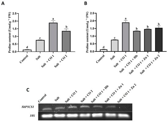 Similar trends of increased proline content have been observed in sorghum [,,,], Lepidium draba from the Brassicaceae family [], and transgenic Arabidopsis plants [] under salt stress. Proline accumulation also acts as a low-molecular-weight antioxidant that scavenges ROS, maintains membrane integrity, and stabilizes enzymes [,]. A further increase in proline content was observed in the presence of CO (1 and 1.5 μM of CO) under salt stress compared to seedlings treated with salt only (Figure 3B). Pretreatment with hemin under salt stress conditions has been reported to enhance proline accumulation in wild-type Arabidopsis leaves []. The increase in proline content induced by exogenous application of CO is linked to the activation of pyrroline-5-carboxylate synthase (P5CS) and a decrease in proline dehydrogenase (ProDH) activity, thereby alleviating salt-induced damage []. The exogenous application of the CO scavenger (Hb) and HO inhibitor (ZnPPIX) significantly inhibited and scavenged CO, decreasing proline accumulation. Salt stress upregulated the SbP5CS1 transcript, which correlated with increased proline content compared to control levels in sorghum seedlings (Figure 3). These results indicate that CO plays a significant role in osmoregulation under salt stress conditions.