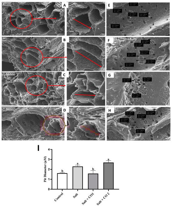 Vascular bundles (xylem and phloem) facilitate the transportation of water, minerals, and nutrients from roots to other plant parts []. The SEM micrographs revealed morphological shrinkage, and deformities of the xylem and phloem, and enlarged porous pit sizes in salt-stressed sorghum roots (Figure 4). A high salt concentration alters the porosity and hydraulic conductivity, which leads to a low water potential and eventually leads to physiological water deficit conditions, destabilization of the cell membrane, and protein degradation owing to the toxic effects of accumulated salt ions (mainly Na+) []. The shrinkage, deformities, and porosity of the vascular bundle and pit caused by the increased salt stress were reversed by CO (Figure 4). The hydrogen bonds between the water molecules generate surface tension and cause water to adhere to the hydrophilic cell wall. This, in turn, guarantees uninterrupted water transport in the xylem tissue. The effect of salt stress on xylem function is an area of active research, and understanding the role of pits in this process could provide valuable insights for developing strategies to mitigate the effects of salt stress in plants [].