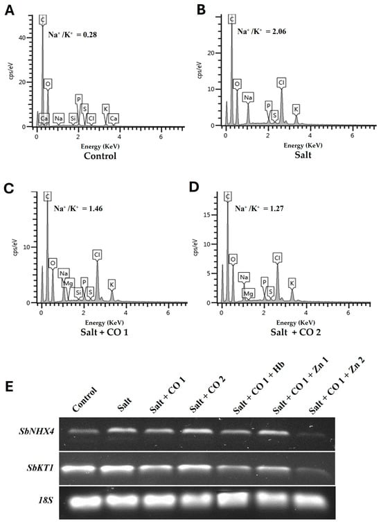 The effect of salt stress on nutrient absorption by sorghum seedlings was analyzed using scanning electron microscopy–energy dispersion X-ray spectroscopy (SEM-EDX) (Figure 5A–D; Supplementary Table S1). Salt stress resulted in a significant increase in Na+ content (1788.24%) and a decrease in K+ content (160%), showing a much larger Na+/K+ ratio (2.06) increase of 635.7% (Figure 5B) than untreated seedlings (Na+/K+ of 0.28), (Figure 5A). Interestingly, CO decreased the level of Na+ absorption by 12.46% (1 μM CO) and 17.45% (1.5 μM CO), whereas K+ absorption was significantly increased by 23.08% (1 μM CO) and 33.97% (1.5 μM CO). As a result, the Na+/K+ ratios were 29.13% and 38.35% in sorghum seedlings treated with salt and 1 μM or 1.5 μM of CO (Figure 5C,D).