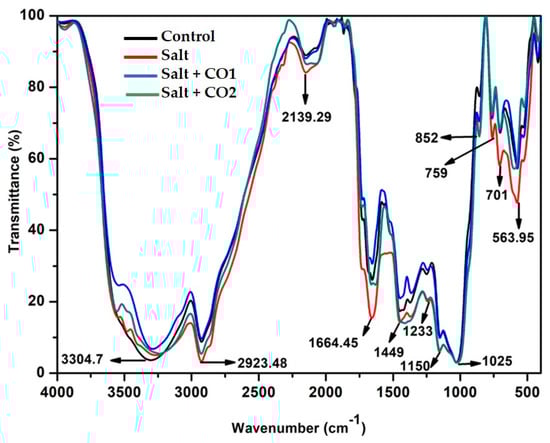 Fourier-transform infrared (FTIR) spectroscopy was used to determine the biodegradation of biomolecules through the visualization of chemical bonds found in the proteins, lipids, and carbohydrates of sorghum seedlings under salt and hematin treatments. The mid-IR spectrum of 4000–400 cm−1 was used for this analysis (Figure 6). The spectral peak at 3304.7 cm−1 represents the polymeric –OH stretch vibrations under the frequency range 3700–3200 cm−1 indicating the presence of phenols and alcohols. The peaks at 2923.48 cm−1 and 1449 cm−1 represent the C-H stretch vibration within the frequency range of 3000–2850 cm−1 and 1485–1445 cm−1, respectively, an indication of the presence of saturated aliphatic alkanes in lipids. Peaks 2139.29 cm−1 and 1664.45 cm−1 represent the -C≡C, -C=C- stretch vibration within the frequencies 2140–2100 cm−1 and 1680–1620 cm−1, respectively, indicating the presence of olefinic alkynes and alkenes in carbohydrates. Peaks 1233, 1150, and 1025 cm−1 represent the -C-N stretch vibration within the frequency range of 1250–1020 cm−1 indicating the presence of primary, secondary, and tertiary amines (proteins) as well as silicate ions (1100–900 cm−1). Peak 852 cm−1 (890–820 cm−1) represents peroxide, while peaks 759, 701 (within frequencies 800–700 cm−1 and 715–570 cm−1) and 563.95 cm−1 (600–500 cm−1) represent the C-Cl/C-I aliphatic choro/Iodo halogenated compounds, C-S thioesters, and S-S disulfides. The FTIR spectra of salt-stressed sorghum seedlings showed peak shifts between 3300 and 2924 cm−1 (phenols and lipids), 1664.45 (carbohydrates), 1449 (lipids), 1150 (proteins), while peaks at 759, 701, and 563.95 cm−1 indicate halogenated compounds. However, exogenously applied hematin (CO1, blue spectra) under salt stress moved the spectral peak shifts to a pattern more similar to the control (black spectra) more than the CO2 (green spectra).