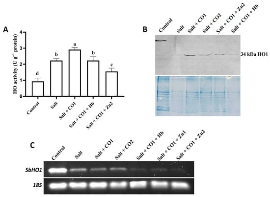 Under stress, plants develop adaptive antioxidant mechanisms to counteract the oxidative damage caused by salt stress in the form of enzymes, such as APX, GPOX, CAT, SOD, and HO, which scavenge ROS and protect the cell [,,]. This study showed that HO activity was induced under salt stress (Figure 7). The HO enzyme activity results were consistent with those of previous studies on Amaranthus tricolor under salt stress [] and Triticum aestivum under different abiotic stresses []. HO1 antioxidant activity was further increased in the presence of 1 μM of CO, whereas Hemoglobin and ZnPPIX reversed this increase in sorghum seedlings. Thus, CO appears to have a cytoprotective role by increasing antioxidant activity (Figure 7A). The protective role of CO under salt stress is due to the increased level of HO1 expression, which is known to protect plants from stress-induced damage [,]. A downregulation was observed in the transcript level of SbHO1 under salt stress in the presence of Hemoglobin, and the HO inhibitor (ZnPPIX), which might be due to internal CO conferring cytoprotection to sorghum seedlings [].