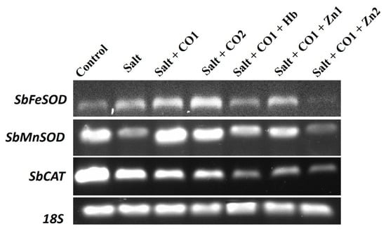 The effect of CO on the transcript levels of the SbFeSOD, SbMnSOD, and SbCAT genes in sorghum under salt stress analyzed by semi quantitative RT-PCR. Treatments: 0 mM of NaCl (control), 250 mM of NaCl (salt), 1 μM of CO donor (Hematin; CO1), and 1.5 μM of CO donor (CO2), 0.1 g/L of hemoglobin (Hb), 5 μM of ZnPPIX (Zn1), and 10 μM of ZnPPIX (Zn2). The 18s rRNA was used as the constitutive reference control.