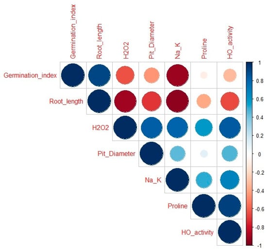 The relationship between different traits studied was analyzed using Pearson’s correlation (Figure 9). In this study, the result showed that proline, pit diameter, Na+/K+, were strongly correlated with a correlation value r closer to 1 SbHO1 enzyme activity, were also positively correlated with a correlation value of r closer to 1. Seedlings root length was found to be strongly correlated with the germination index (r = 0.9). Oxidative marker H2O2 was strongly correlated with proline (r = 0.6), pit diameter (r = 0.83), Na+/K+ (r = 0.8), and HO1 enzyme activity (r = 0.5). H2O2 exhibited negative correlations with germination index and root length with a correlation value r closer to −1. Furthermore, proline was positively correlated to Na+/K+ (r = 0.5), and SbHO1 enzyme activity (r = 0.70).