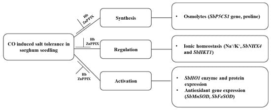 The transcript level of Sorghum bicolor heme oxygenase 1 (SbHO1) was constitutively expressed under control conditions (Figure 7C). Salt stress decreased SbHO1 transcription levels compared to the control. Treatment with 1 μM and 1.5 μM of CO further decreased SbHO1 transcription under salt stress. In the presence of 1 μM of CO, the SbHO1 transcription level was further scavenged by 0.1 g/L of Hb and the HO inhibitor, ZnPPIX (5 μM and 10 μM of ZnPPIX) under salt stress (Figure 7C).