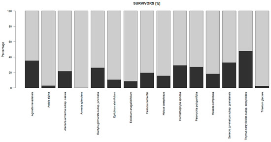 Starting from a set of 15 taxa from eight families, with two life forms (chamephytes and hemicryptophytes) belonging to seven plant communities, as an overall result, a total of up to 24.53% of surviving plants (Figure 1) with 950 individuals in total surviving out of the 3873 planted was observed. The best survival rates (Table S1) were obtained by three taxa (Plantago holosteum, Thymus serpylloides subsp. serpylloides, and Arenaria pungens subsp. pungens), which achieved results above 60%. On the contrary, Trisetum glaciale, Arabis alpina, and Epilobium anagallidifolium did not reach 10%, considering an overall average result of 29.76 ± 18.19%. Regarding the rest of the characteristics of these species, there was no pattern that differentiated the groups from the rest (plot, snow cover, etc.), either in the groups of the greatest success or those of the greatest failure. The only characteristic shared by the most successful species, along with some others in the middle zone of the table, was biotype (pulvinular chamaephytes). The second year after planting, the monitored data presented very low losses compared with those for the first year monitored. However, the acclimatization process observed was so rapid that it was difficult to distinguish planted specimens from other spontaneous ones or from those that already inhabited the stand.