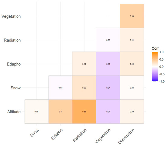 Correlations between variables involved in the GLM analysis, containing Spearman’s correlation coefficients. Altitude: altitude; Snow: snow cover permanence; Edafo: edaphology of the ground; Radiation: peak solar time in MJ·m−2; Vegetation.: plant community; Distribution.: plant distribution area.