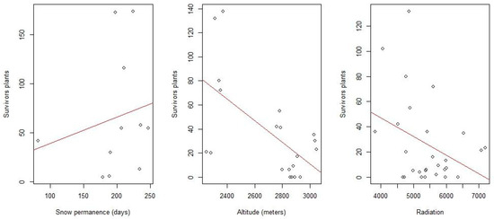 Scatterplots of survivors with trend lines in red. From left to right: snow permanence (days), altitude (meters) and radiation (MJ·m−2).