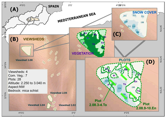 (A) Map of study location where plants were located in Spain, SE Iberian Peninsula (square). (B) Map with viewshed limits in Sierra Nevada National Park. (C) Schematic representation of variables used (in green and blue respectively) to generate final plots. (D) Parcel location scheme in green with variables.