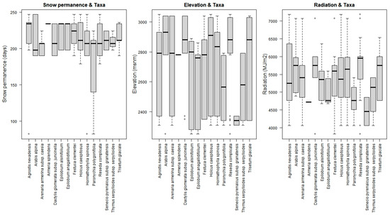 Boxplot with the plantations of each taxon, distributed across the continuous variables considered in the analysis (snow permanence, elevation, and radiation).